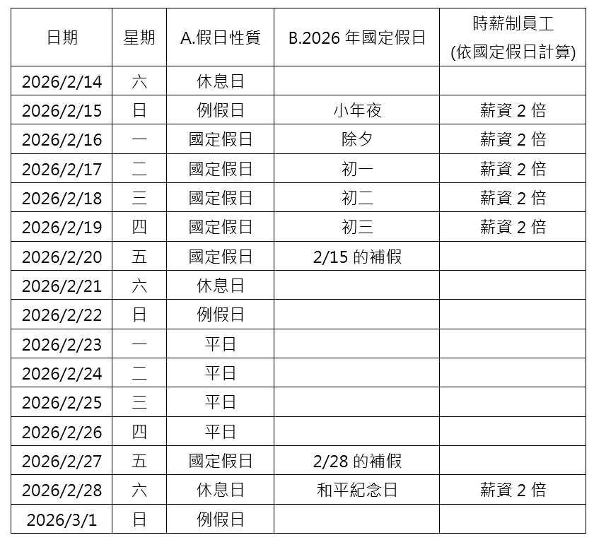 | 工作時間 | 平日 | 國定假日 | 休息日 | 例假日 |