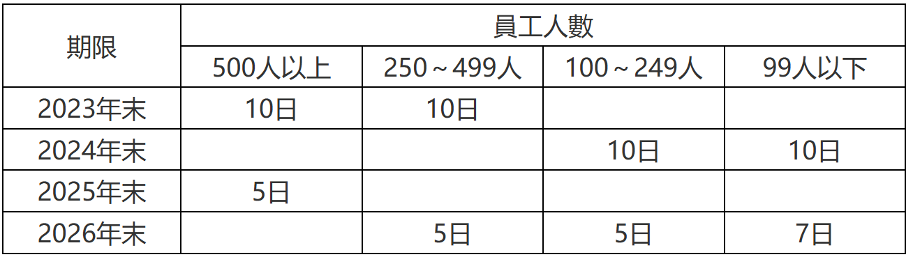 該指導原則依照企業規模的不同,規定自出勤結算日起算,須於一定天數內(如下表所示)完成薪資發放。
