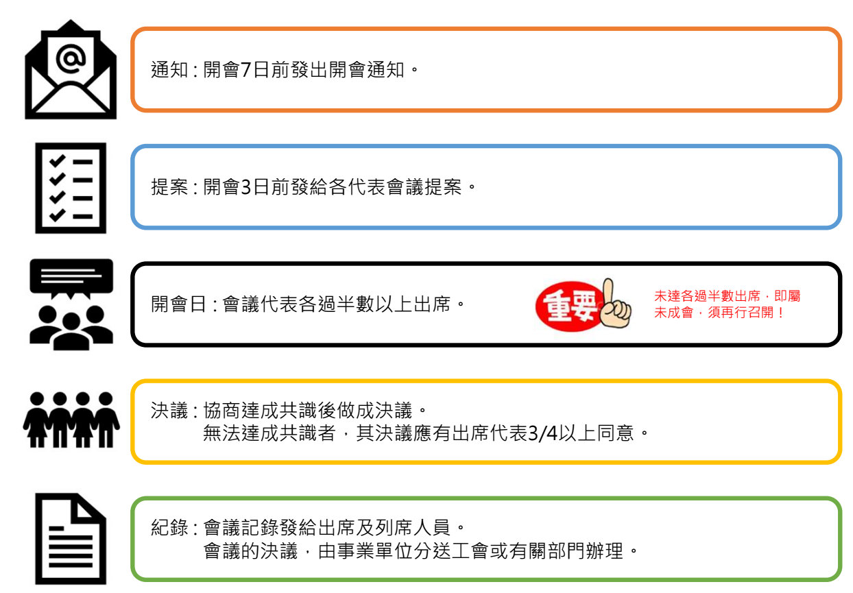為了讓與會代表有充足時間準備及徵詢員工意見,會議通知須在開會7天前發出、提案須開會3天前分送給代表,依民法規定期間計算方式,例如:若在 9月9日 發出開會通知,則通知期間從 9月10日 起算,到 9月16日 為滿 7 天,會議應安排在 9月17日或之後。