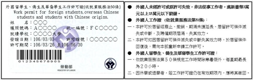 労働部に「僑外生工作許可證(留学生就労許可証)」を申請し、取得してからでなければ、合法的にアルバイトをすることはできません。雇用者は許可証の有効期限を確認し、雇用期間中に常に有効であることを確認する必要があります。